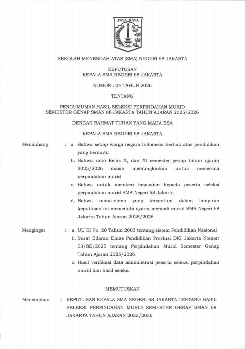 Assalamu’alaikum Warahmatullahi Wabarakaatuh. Selamat datang di website SMA Negeri 68 Jakarta.